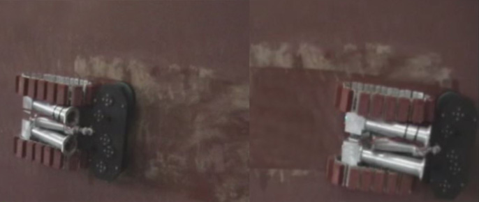 Ferromagnetic surface Liquid Tank Inspection / Decontamination Robot, Originally developed for Ship Hull cleaning and modified for the nuclear industry. This robot works in liquid filled tanks or on dry surfaces. Its objective is to scrub the surface gently to reduce the contamination level on the walls. When not scrubbing, sensors can be mounted for detailed inspection.