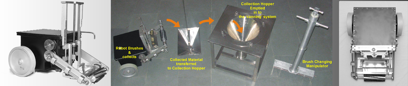 The robot can be operated in RCC or SS lined SFSB’s. The material collected is transferred underwater to a holding container which in turn transfers it to a canning system.